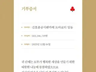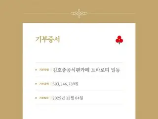 金浩俊的官方粉絲俱樂部「Tobaroti」在年末繼續行善……捐贈了約5億韓元。