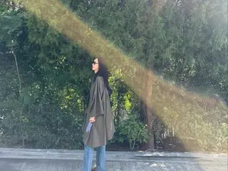 公開的照片中,崔智友身穿法式外套、牛仔褲,戴著墨鏡,走在綠樹成蔭的迷人小路上。