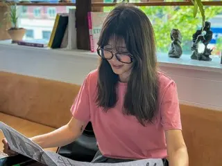 已發布。照片中,崔貞在陽光下微笑著看著鏡頭,同時還在看報紙。粉紅色T恤和黑色