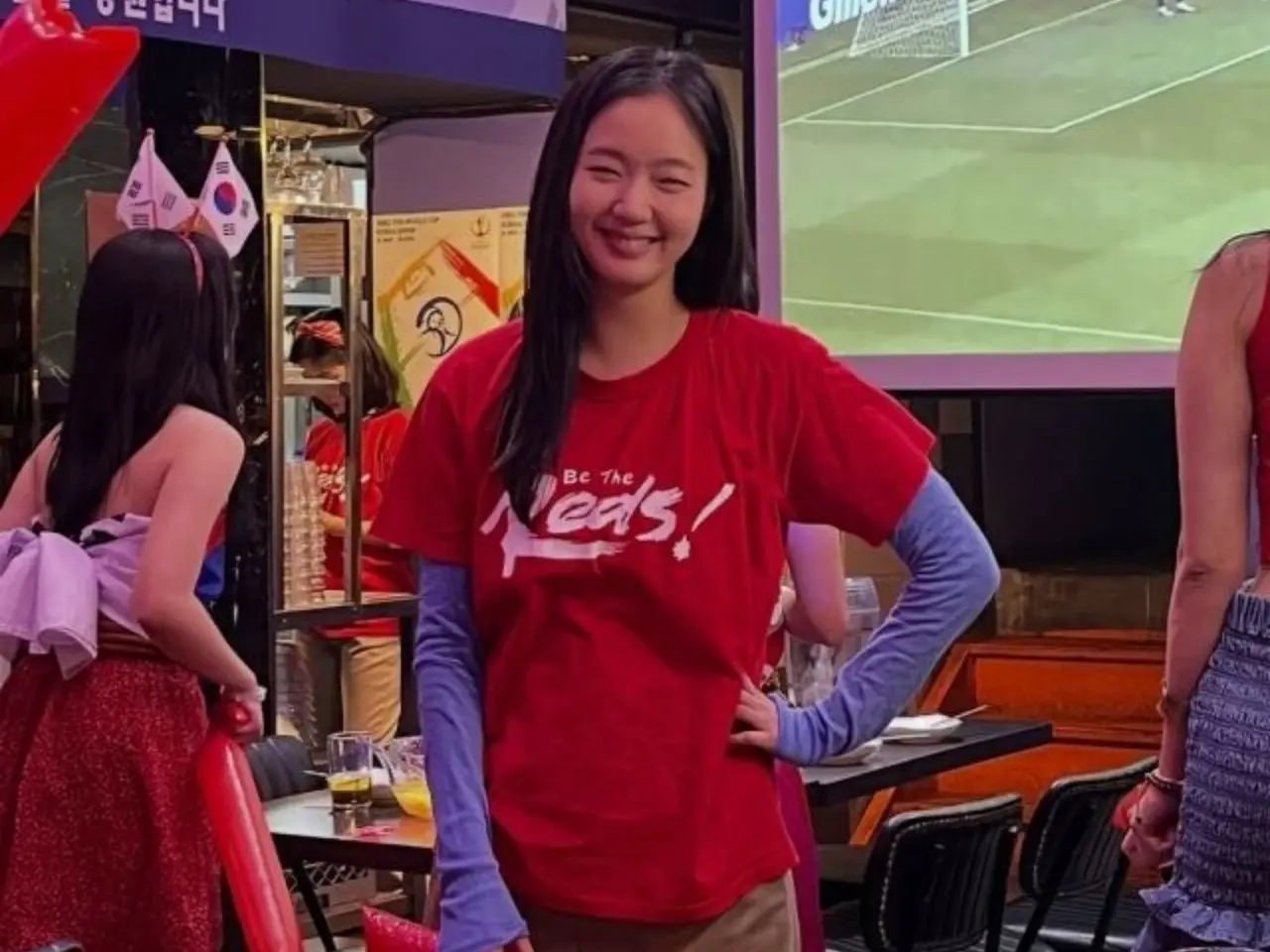 身後的大螢幕上,正播放著當時世界盃的比賽畫面,紅魔隊員們都穿著紅色T卹,現場熱鬧非凡。