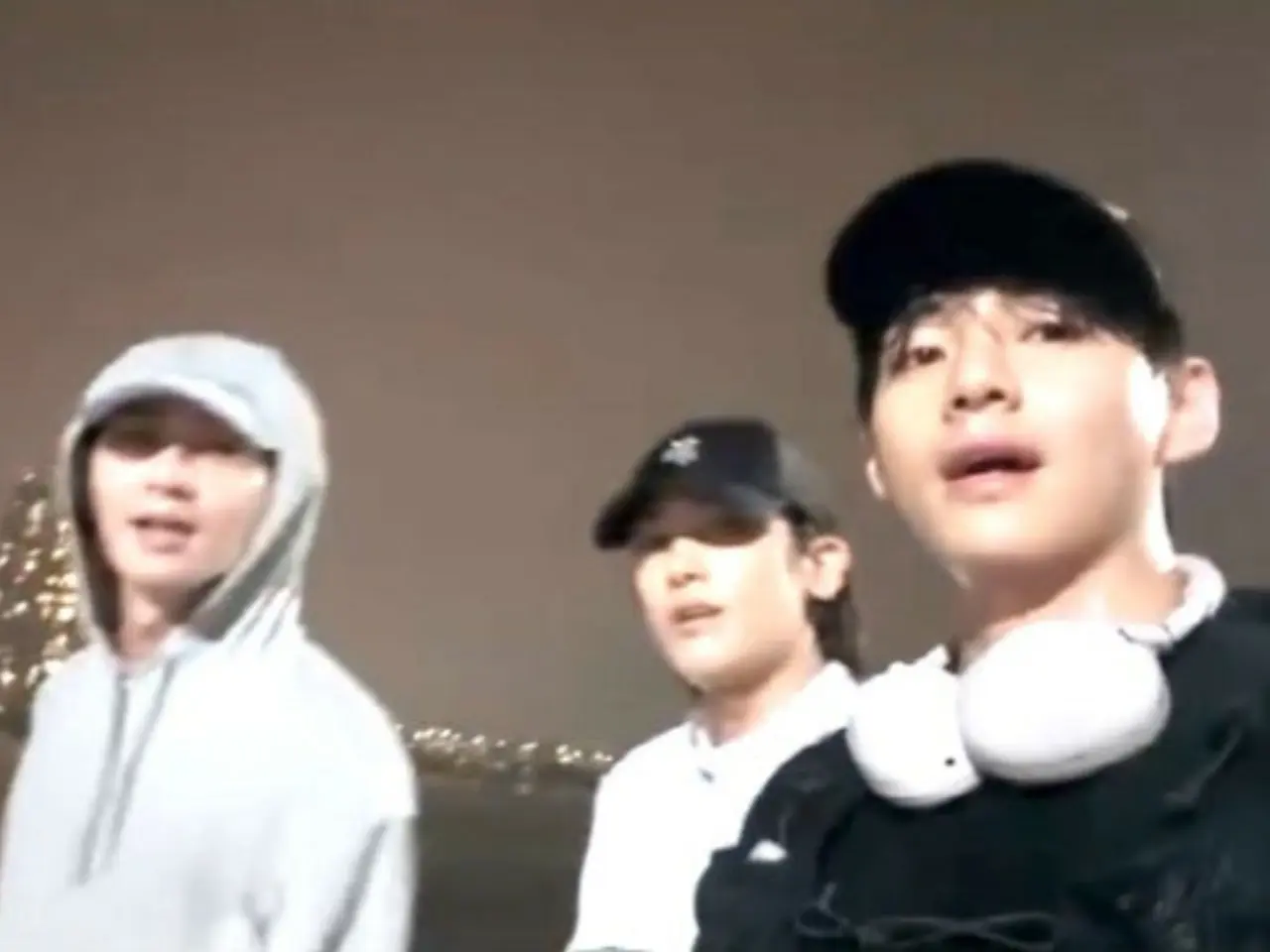 三人穿著休閒服,帽子拉得很低,在雨中漫步在漢江邊,享受著簡單的日常生活。