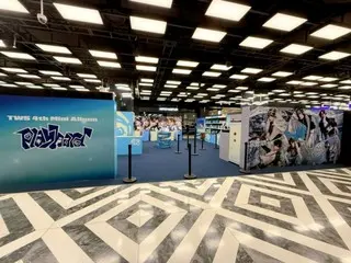 牆上,彷彿從漫畫裡跳出來的「TWS」成員們的臉龐向粉絲們致意,最前面的拍照區則擺放著專輯中使用的翅膀形狀的物品。