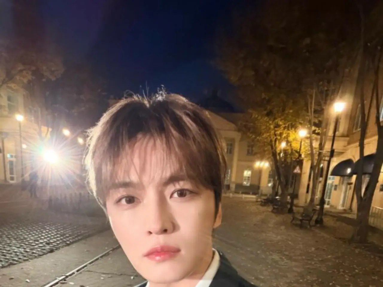 照片顯示,J-JUN身穿黑色西裝,出現在夜晚的城市街頭。